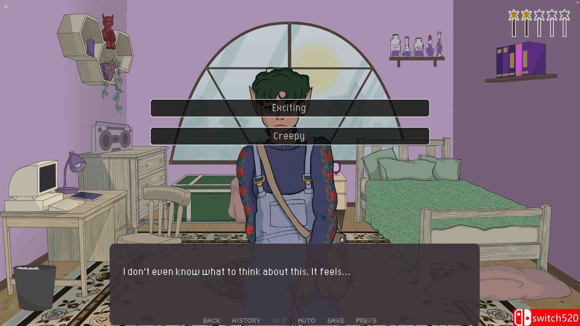 《法疫时代的爱情》是一款冒险解密类(AVG)游戏,《法疫时代的爱情》是一款叙事驱动的短篇冒险游戏,融合视觉小说与互动选择玩法。玩家将扮演魔法大学学生Lauren,在疫情封锁初期独自度过两天时光,并在迷茫与孤独中做出影响人生走向的决定。游戏设定在一个融合精灵、地精与魔法的80年代风格世界中,玩家需要在日常活动、情感关系与未知危机之间作出选择,推动剧情分支发展,不同决定将导向完全不同的结局。switch520